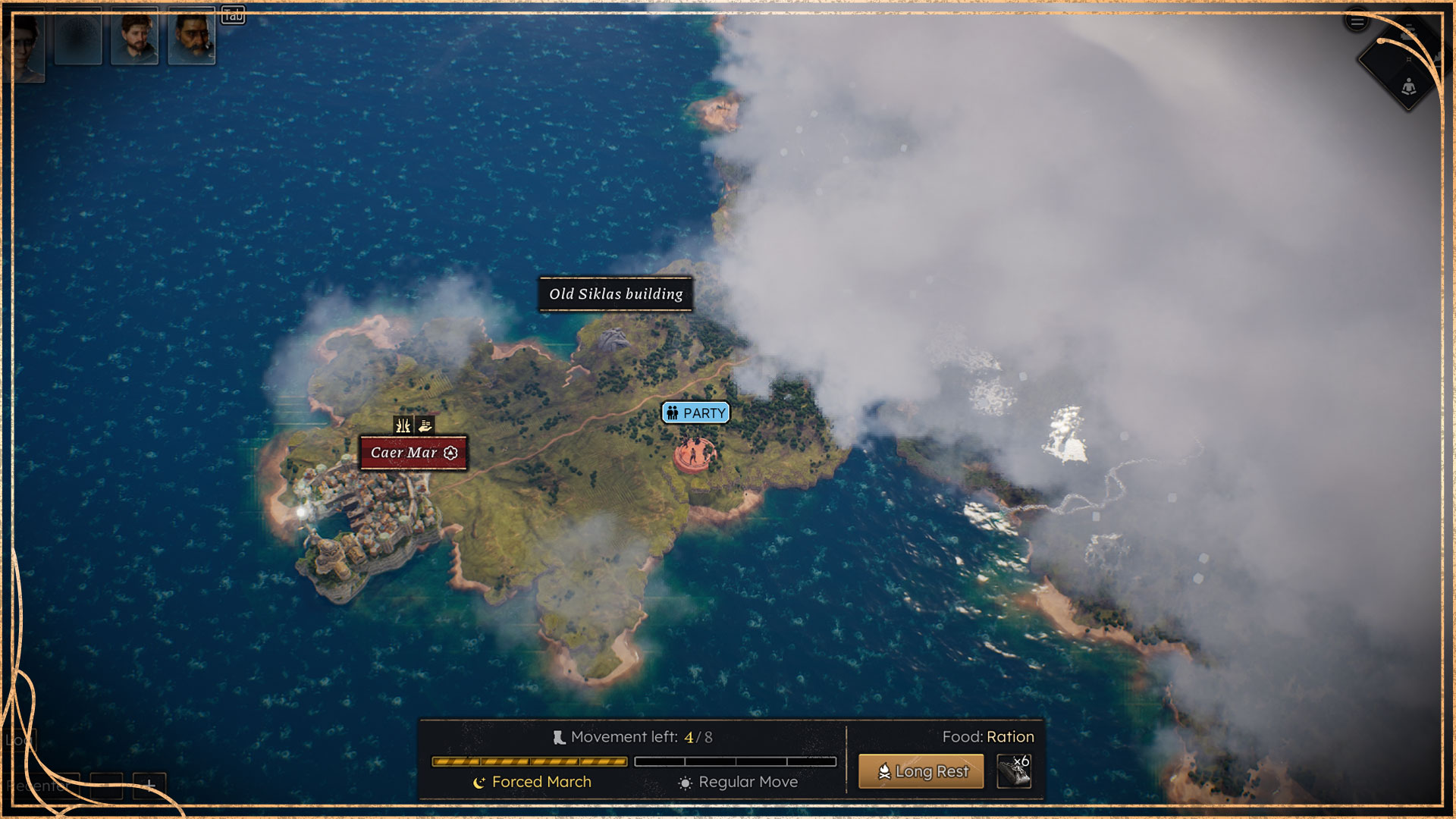 That’s also why you’re seeing a Movement bar on the bottom of the screen - with 4 Regular Move points, and 4 Forced March points. Depending on the terrain you’re crossing, you will burn a different amount of movement points - forcing you to take more time when not sticking to the roads between major settlements.